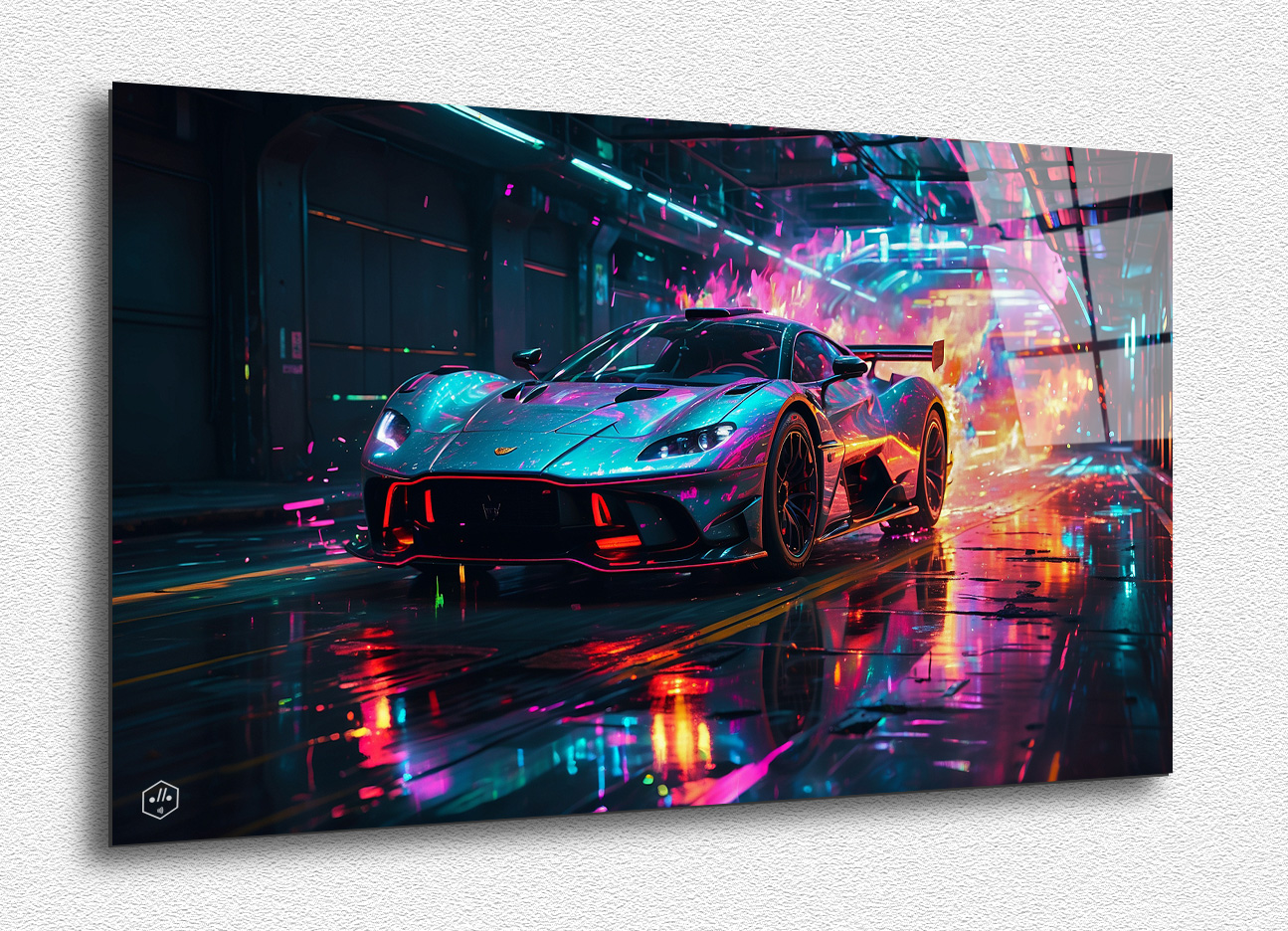 A futuristic scene of the Aston Martin Valkyrie streaking through a high-tech tunnel, with LED lights lining the walls and ceiling.